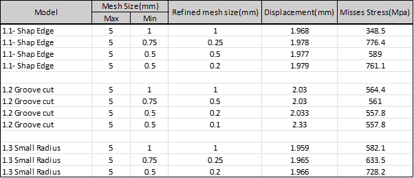 The clamp frames used for sealing are subjected to high pressure and cyclic loading during the forming process. This create cracks on the sharp edges of the frame which propogates with continuous usage. This project aims explore possible ways to improve/repair the existing frames with minimal changes to the existing design with the design constraints. The mesh here shows a simplified symmetric section of the frame. The sharp inner edges cannnot be rounded off because doing so would require modifications to be made on all the tools (more than 100) which uses this frame. The frames are also placed in a tight space during forming making it difficult to thicken the surface. The easiest, cheapest and the most practical method obtained from analysis is to thicken the weld on the edges and round off the inner edge towads the outside. This method may increase the stress on the edge (well within elastic limit), but works much better in terms of fatigue resistance and cracking.